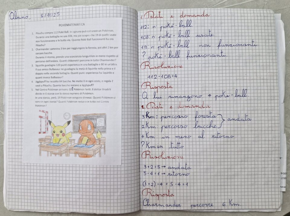Ho preparato una serie di problemi ambientati nel mondo Pokémon e, successivamente, ho proposto due schede di calcolo mentale: una in versione classica, arricchita però dall’immagine (creata con l’intelligenza artificiale) di Pokémon a scuola, e un’altra intitolata “Missione Pokéball”. In quest’ultima attività, i bambini, risolvendo calcoli a mente, dovevano aiutare ciascun personaggio a raggiungere la propria Pokéball.
